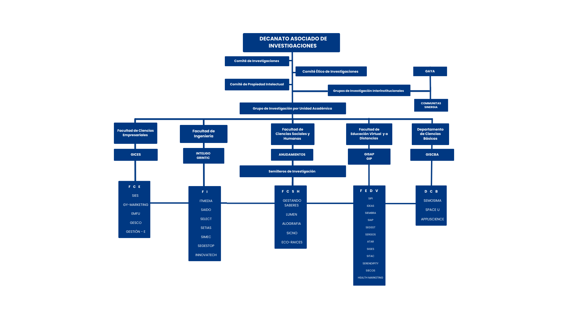 Estructura organizacional de la investigación Inicio Investigaciones Estructura organizacional de la investigación Investigaciones Documentos de investigaciones Estructura organizacional de la investigación Grupos de investigación Grupos avalados por la Institución Grupo de investigación GAYA Grupo de investigación GIP Grupo de investigación ANUDAMIENTOS Grupo de investigación GISAP Grupo de investigación GRINTIC Grupo de investigación INTELIGO Grupo de investigación GICES Grupo de investigación GISCBA Grupo de investigación COMMUNITAS SINERGIA Pasos para conformar un grupo de investigación Pasos para presentar un proyecto de investigación Semilleros de Investigación Eventos de Investigaciones Publicaciones de Investigaciones Convocatorias generales Equipo de Trabajo Estructura organizacional de la investigación